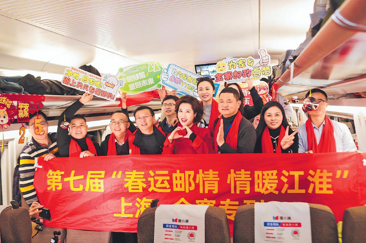 1月22日,安徽省第七屆“春運郵情 情暖江淮”活動迎接皖籍務工創業人員返鄉專列(廂)首發儀式在上海松江、江蘇無錫、浙江臺州三地同步舉行,當日開行的“上海—金寨”專列和“無錫—太和”“臺州—青陽”列車專廂免費承運776名皖籍務工人員返鄉過年。本屆活動預計開通專列(專廂)30趟,接回返鄉務工創業人員6500余人。