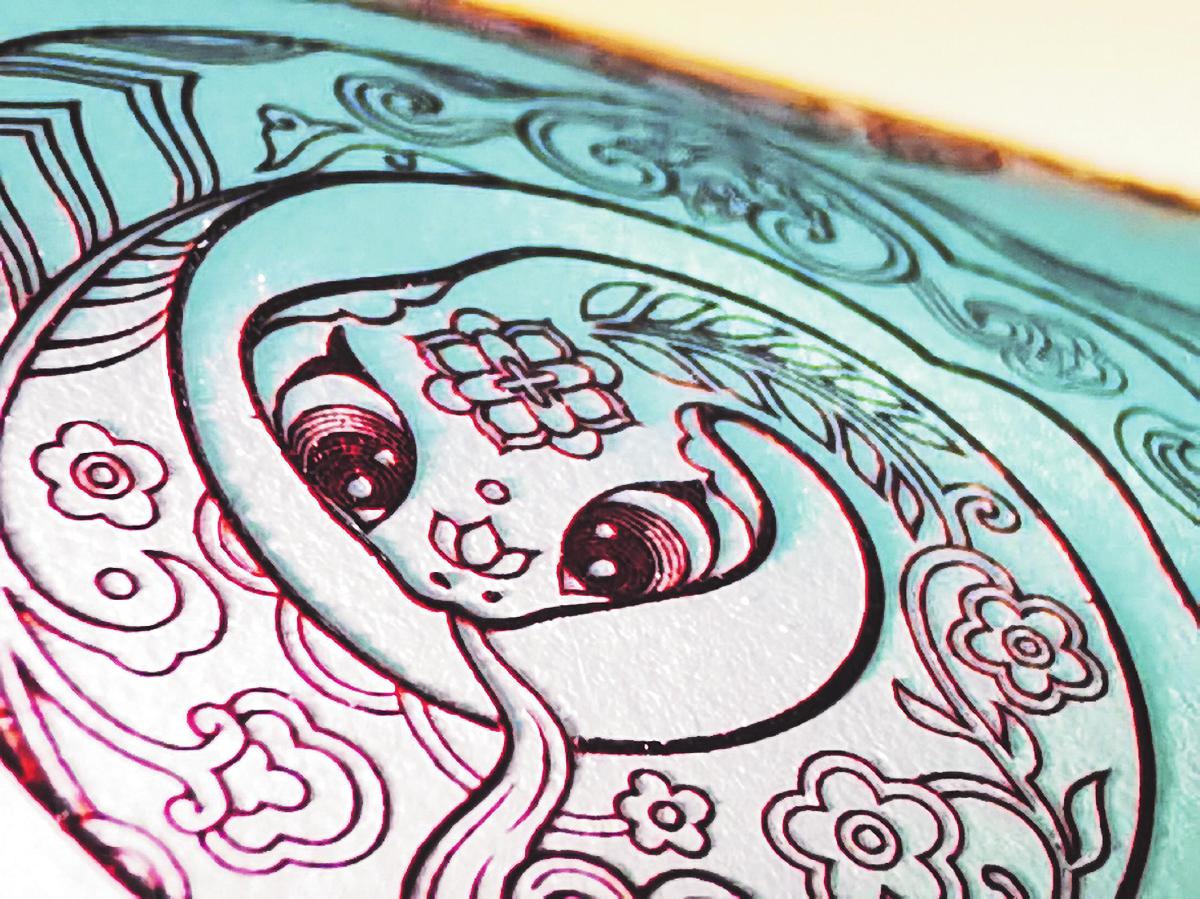 優秀的印制質量離不開優秀的原材料。在此次生肖郵票的印制中,北京郵票廠首次使用了新研發的觸感雕刻油墨。雕刻油墨顏色更深更亮,觸感更明顯。用放大鏡觀察《乙巳年》特種郵票中的雕刻線條,可以看到繪畫筆觸似的刀鋒,用手指在紙上輕輕撫摸時,圖像輪廓有明顯的凸起感。