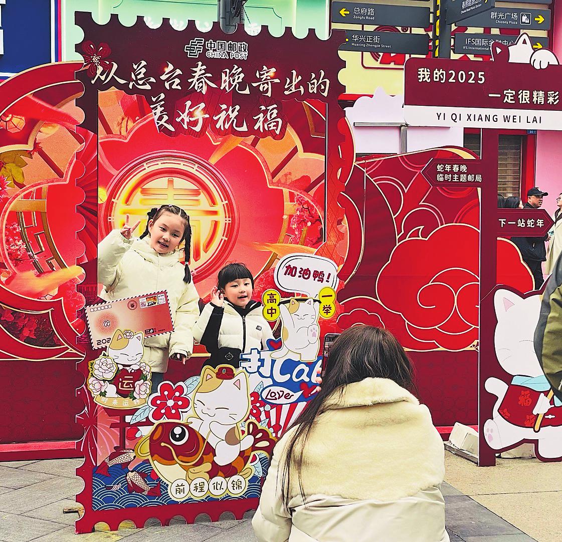 四川 成都市郵政分公司與成都鐵路傳媒共同在成都東站打造春晚臨時郵局。該臨時郵局為往來旅客準備了8枚生肖文化紀念章、《從2025年中央廣播電視總臺春節聯歡晚會寄出的美好祝福》系列郵資封等郵品,引得旅客紛紛打卡購買。□王妝硯 龔靜琳 攝影報道