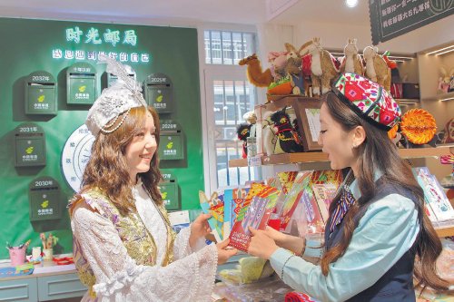 走進大巴扎主題郵局,琳瑯滿目的文創(chuàng)產(chǎn)品吸引了眾多游客駐足觀賞、購買。整面墻的新疆風(fēng)光明信片和醒目的“時光郵局”4個字最先抓住游客的眼球。來自全國各地的年輕人將對未來的期待、對生活的感悟、對親人的思念,寫在信紙上裝入信封,投入“時光郵局”的信箱,寄給未來的自己,充滿儀式感。