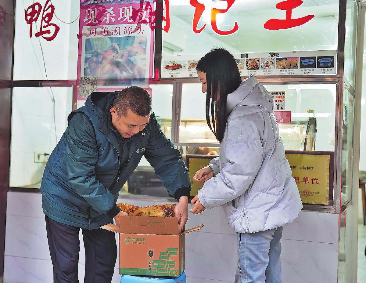 在熱門(mén)的樂(lè)山甜皮鴨店,郵政攬投員主動(dòng)上門(mén)攬件,幫助游客實(shí)現(xiàn)“即買(mǎi)即寄”旅行零負(fù)擔(dān)。□何宇龍 攝