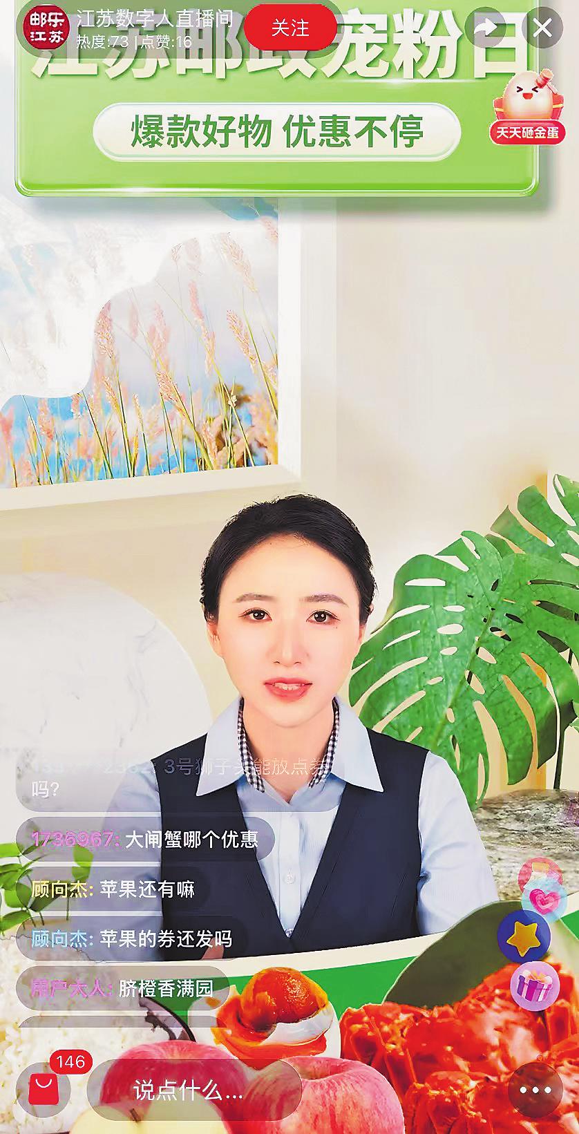 “每一口,都能感受到牛肉的鮮美和高原的純凈……”2024年3月4日,一身大紅色衛(wèi)衣、體態(tài)端莊、表情親和的數(shù)字人“小郵”,首次亮相“江蘇郵政寵粉日”主題直播活動(dòng),語(yǔ)言流利地兜售著各地優(yōu)質(zhì)農(nóng)產(chǎn)品。“蛋黃中的油脂晶瑩剔透,散發(fā)著濃郁的香氣。蛋白則如同玉石般光滑細(xì)膩,令人垂涎欲滴。我們還提供了多種口味供您選擇,包括原味、香辣味、香蔥味……”8個(gè)月后,郵樂(lè)江蘇數(shù)字人直播間“雙11”寵粉專場(chǎng),第二期數(shù)字人、江蘇金牌主播潘佳的數(shù)字克隆體,又在向“寶子們”推薦江蘇優(yōu)質(zhì)特產(chǎn)高郵咸鴨蛋。