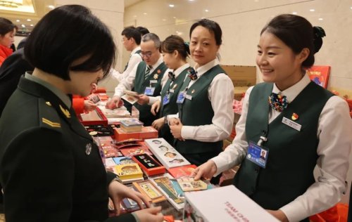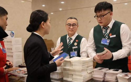 在駐地臨時郵局的柜臺前,代表委員和兩會工作人員或翻閱《郵政服務指南》了解郵票郵品設計內涵,或用手機拍攝文創冰箱貼為親友挑選禮物,更有集郵愛好者仔細對比郵品的工藝細節?!霸趦蓵盏那捌冢易鲎懔斯φn,學習了產品特點和服務要點。能參加這次全國兩會的服務感到非常榮幸,希望能圓滿地完成此次任務。”第一次參加全國兩會郵政服務的許勇介紹。