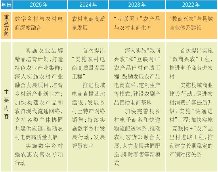 2月23日,2025年中央一號(hào)文件正式對(duì)外發(fā)布。這是黨的十八大以來,中央連續(xù)發(fā)出的第13個(gè)指導(dǎo)“三農(nóng)”工作的一號(hào)文件。近年中央一號(hào)文件及相關(guān)政策顯示,農(nóng)村電商已成為推動(dòng)鄉(xiāng)村振興和實(shí)現(xiàn)農(nóng)業(yè)現(xiàn)代化的重要抓手,政策導(dǎo)向逐步深化,覆蓋基礎(chǔ)設(shè)施建設(shè)、產(chǎn)業(yè)融合、數(shù)字化升級(jí)等多個(gè)維度,從銷售到全產(chǎn)業(yè)鏈整合,從科技賦能到產(chǎn)業(yè)創(chuàng)新,從一二三產(chǎn)業(yè)融合到生態(tài)體系建設(shè),持續(xù)為推進(jìn)農(nóng)業(yè)現(xiàn)代化和鄉(xiāng)村全面振興提供強(qiáng)大的活力與動(dòng)力。