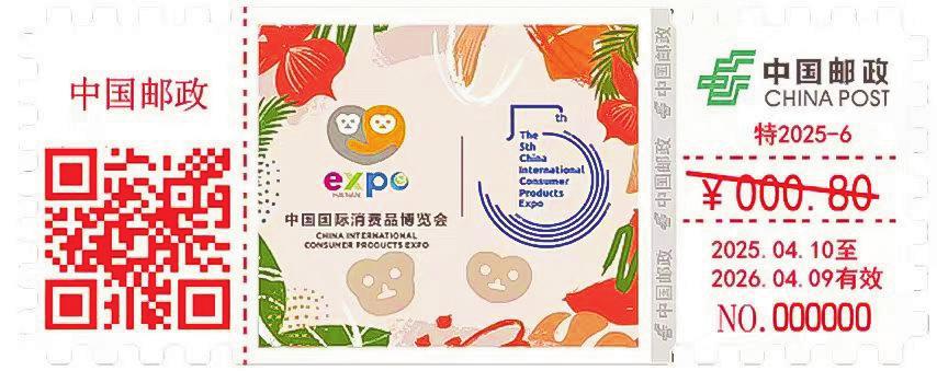 “第五屆中國國際消費品博覽會數字化彩色郵資機宣傳戳”采用目前最新款TS71郵資機制作,每一枚戳的規格為72mm×28.5mm,面值為0.8元,使用期限為2025年4月10日至2026年4月9日,全國共發行12.1萬枚。票面設計分為左中右三塊區域,左側印有“中國郵政”字樣;中間區域為主圖部分,展現的是消博會的吉祥物“元元”和“宵宵”擁抱的形象,吉祥物的原型是海南獨有、世界珍貴的靈長類動物長臂猿,同時巧妙地融合了海南熱帶雨林的自然風光以及消博會5周年的標識,既展現消博會的精品路線定位,又蘊含了海南特色風貌;右側的上方印有“中國郵政”字樣及標識,下方則是資費及使用期限;中間主圖及右側之間印有郵政特殊金屬防偽線。
