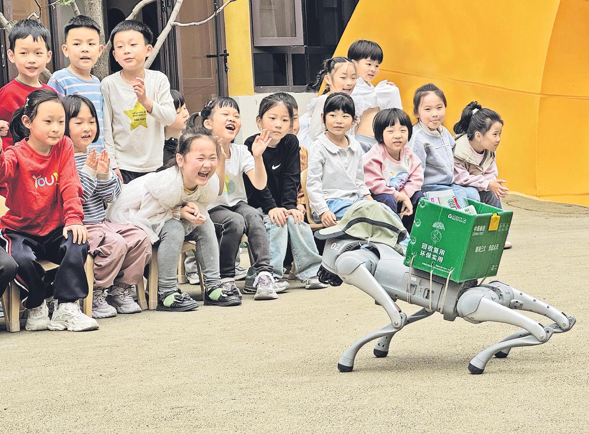 小朋友通過“小小郵遞員”“小小銀行家”等角色扮演,與機器狗互動,體驗送報、送信、送快遞,學習認識錢幣等知識?,F場還設立了集郵文創產品、幼兒畫報圖書展示區,吸引了眾多師生前來打卡。圖為“郵小驛”機器狗一出場就獲得小朋友喝彩。