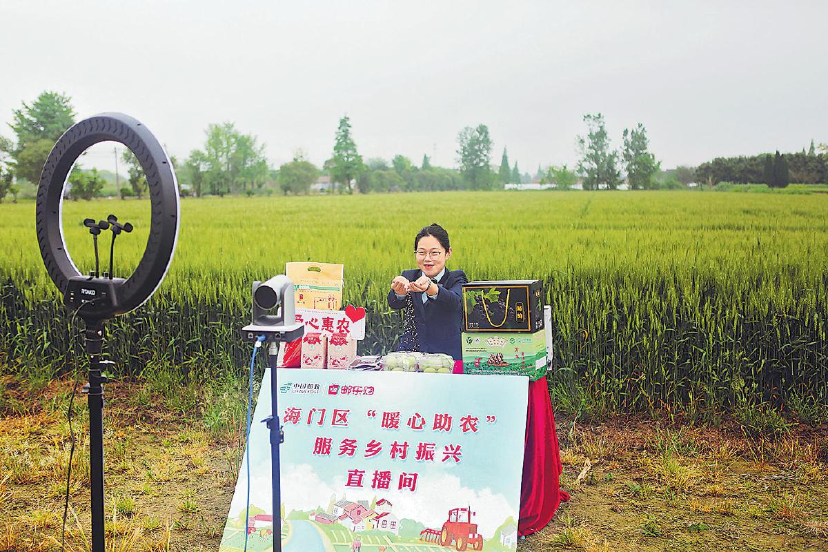 南通市海門(mén)區(qū)分公司將“興農(nóng)驛站”直播間設(shè)在田間地頭。(圖片由江蘇省分公司市場(chǎng)部提供)