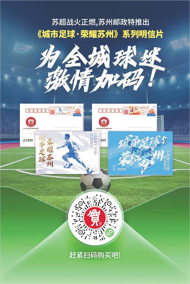 蘇州郵政高度重視“蘇超”賽事品牌內(nèi)涵,統(tǒng)籌部署賽事服務(wù)方案。吳江區(qū)郵政分公司第一時間主動對接賽事主辦方蘇州市體育局,率先斬獲“蘇超”蘇州賽區(qū)官方獨(dú)家授權(quán),成為賽區(qū)唯一指定紀(jì)念郵品服務(wù)運(yùn)營商。郵政專業(yè)團(tuán)隊(duì)結(jié)合賽事視覺識別系統(tǒng)和蘇州地域文化,設(shè)計(jì)開發(fā)《城市足球 榮耀蘇州》系列明信片A、B兩套共12款。所有明信片均加印賽事官方授權(quán)標(biāo)識,具備唯一性與權(quán)威性,滿足收藏、饋贈和球迷助威等多樣需求。賽事舉辦期間,蘇州郵政在場館外設(shè)立“蘇超”主題郵局,現(xiàn)場展示與蓋戳發(fā)售,成為球迷合影打卡與文化消費(fèi)的熱門地標(biāo),高效助力賽事文化傳播。