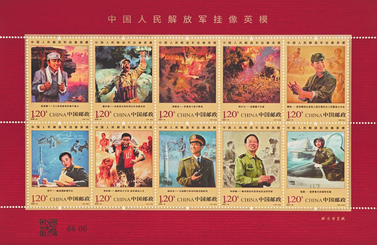 8月1日,《中國(guó)人民解放軍掛像英模》紀(jì)念郵票發(fā)行。該套郵票一套10枚,展現(xiàn)的英模人物分別是:張思德——為人民利益而死重于泰山,董存瑞——完成黨交給的艱巨任務(wù)最光榮,黃繼光——英勇戰(zhàn)斗奮不顧身,邱少云——紀(jì)律重于生命,雷鋒——把有限的生命投入到無(wú)限的為人民服務(wù)之中去,蘇寧——獻(xiàn)身國(guó)防現(xiàn)代化,李向群——胸懷遠(yuǎn)大志向追求高尚人生,楊業(yè)功——忠誠(chéng)履行使命的模范指揮員,林俊德——獻(xiàn)身國(guó)防科技事業(yè)杰出科學(xué)家,張超——逐夢(mèng)海天的強(qiáng)軍先鋒。