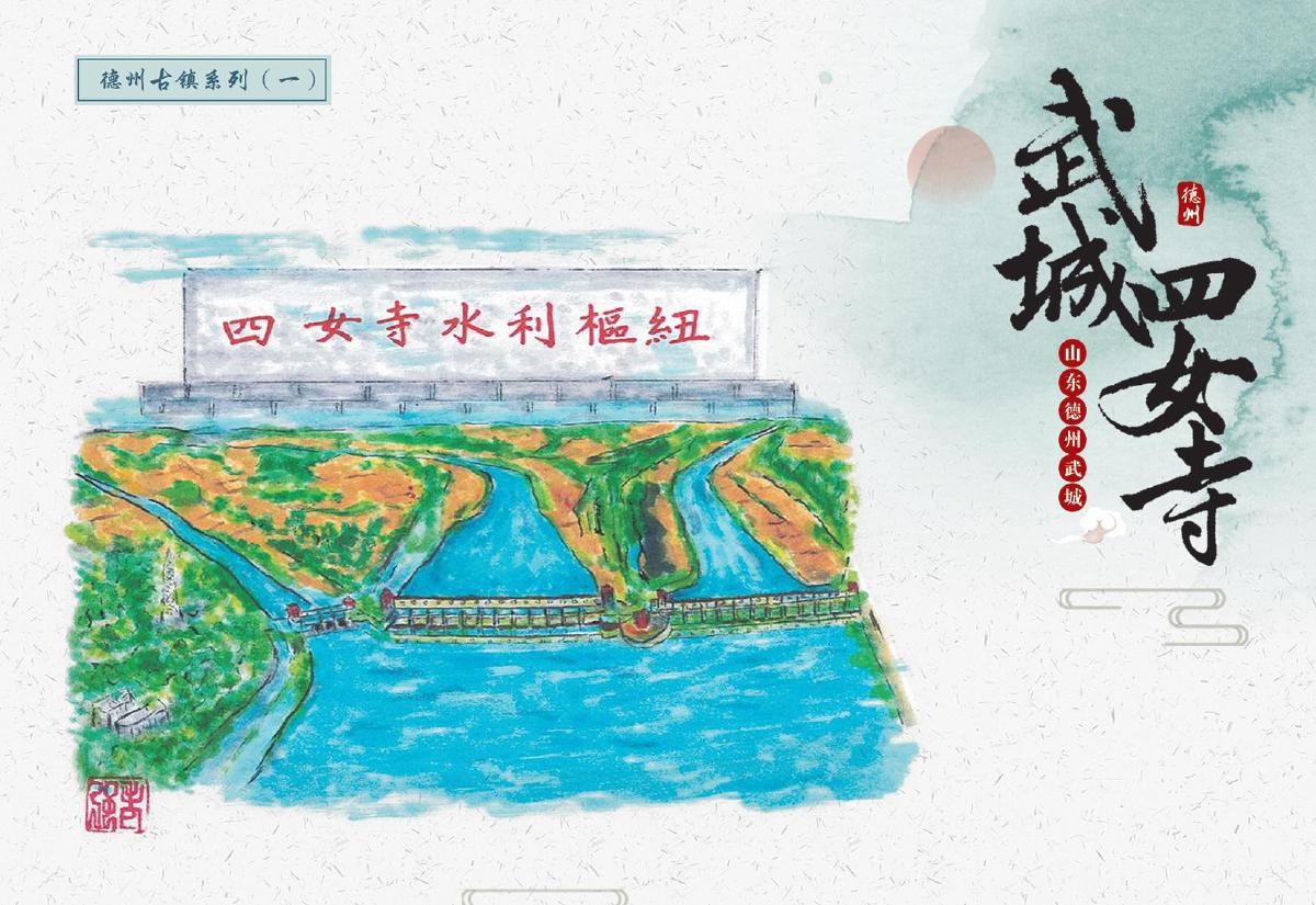 此次首發(fā)的文創(chuàng)產(chǎn)品涵蓋郵資封、明信片、郵資機(jī)宣傳戳及主題宣傳戳四大類,每一件都浸潤(rùn)著四女寺的文化基因。其中,“四女”郵資封(右上圖)以工筆重彩呈現(xiàn)經(jīng)典場(chǎng)景:畫面中四位女子于槐樹下漫步,旁側(cè)牌坊古樸,飛鳥點(diǎn)綴天際,還原“四女侍親,栽槐立誓”的民間傳說,四女常伴樹側(cè),行孝事、話桑麻,樹與人相襯成景,演繹著傳統(tǒng)孝道的溫度,讓古老美德在時(shí)光里熠熠生輝,供后人感懷、傳揚(yáng);而“四女寺水利樞紐”明信片(右下圖)則通過航拍視角與細(xì)節(jié)特寫的結(jié)合,展現(xiàn)這座黃河下游重要水利工程的宏偉氣勢(shì)——堤壩蜿蜒如巨龍伏波,閘門啟閉間盡顯古人治水的智慧結(jié)晶,讓現(xiàn)代觀者得以觸摸歷史的溫度。
