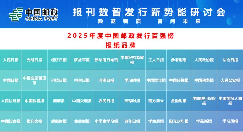 會上,集團公司報刊發行局發布了備受關注的“2025年度中國郵政發行百強榜”,包括《人民日報》、《光明日報》在內的40家報紙品牌,《求是》、《中國紀檢監察》等50家期刊品牌,以及參考消息數字報、人民日報健康客戶端等10家數媒品牌上榜。此次百強評定綜合考慮了郵發報刊的發行量、品牌影響力、媒體融合發展的貢獻度等多個指標。此外,報刊發行局在此次會上還與河南日報報業集團、《人民論壇》雜志社、中國交通報社、中國農業出版社、中航出版傳媒有限責任公司以及《財經》雜志等多家單位簽訂戰略合作協議,標志著中國郵政在報刊數智發行領域合作網絡的進一步拓展。
