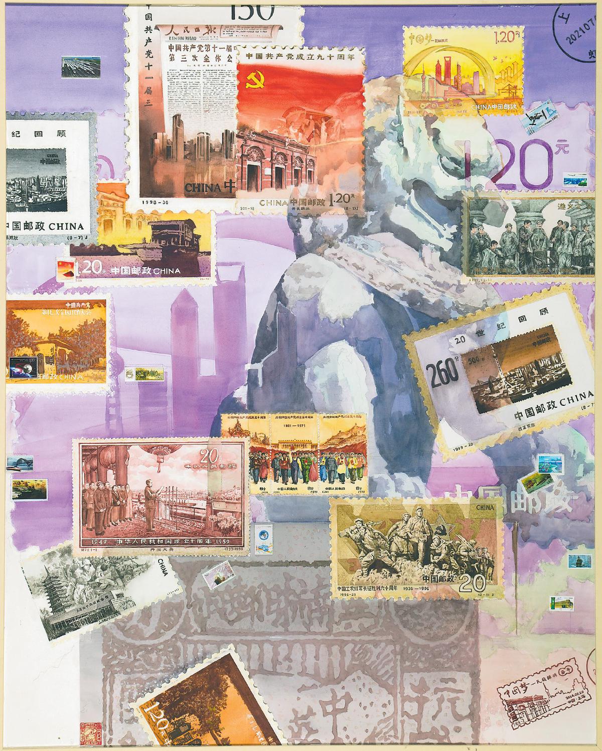 從郵票圖案的細(xì)節(jié)還原,到色彩色調(diào)的精準(zhǔn)把控,田燕萍始終追求用匠心打磨精品。她借鑒“蒙太奇”電影手法,用繪畫串聯(lián)起不同時(shí)代的郵票;背景特意繪制故宮石獅雕像,象征“蘇醒的雄獅”;底色選用紫色,取“紫氣東來”的吉祥寓意。每一處設(shè)計(jì)、每一筆勾勒,都藏著她對品質(zhì)的追求。