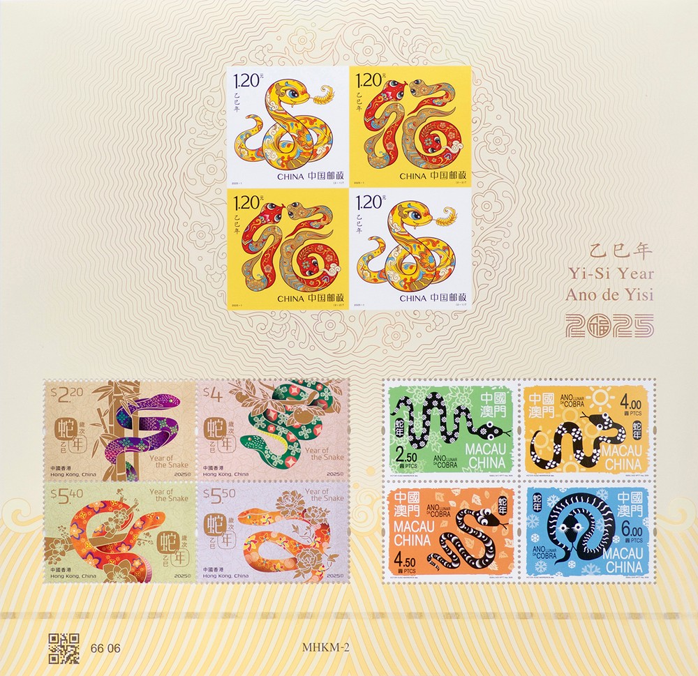另與香港郵政、澳門郵電共同印制同題材三地小全張1枚,內(nèi)含中國郵政郵票4枚(2套,無齒孔),香港郵政、澳門郵電郵票各4枚。小全張編號:MHKM-2。成品規(guī)格:206×200毫米。版別:膠雕套印。印制廠:河南省郵電科技有限公司。郵折售價:人民幣52元。計(jì)劃發(fā)行數(shù)量:40.5萬枚(不含港澳地區(qū))。