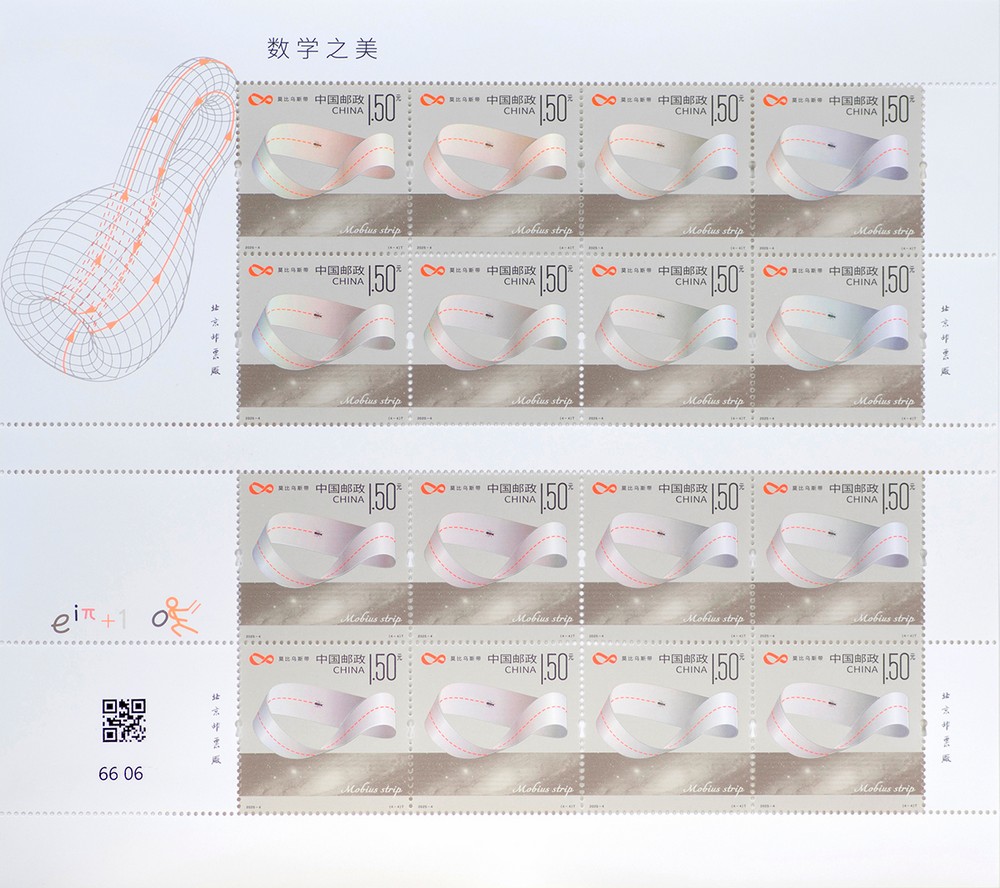 該套郵票設計語言現代,使人眼前一亮。第一枚“圓周率”作為廣為人知的數學常數,貫穿于幾何、物理等眾多學科。郵票元素包含了π的本質定義,以極細線表現早期經典割圓法,并將圓周率小數點后996位以縮微文字的方式呈現于畫面,特別通過橘色設計突出前7位,紀念我國南北朝時期數學家祖沖之。第二枚“勾股定理”是中國古代幾何學的成就之一。它給出了直角三角形三邊的長度關系,即任意一個直角三角形的兩條直角邊長度平方之和等于斜邊長度的平方。郵票在局部采用燙印工藝,以分層的視覺形式展現了證明過程。第三枚“歐拉公式”(eiπ +1=0)被譽為“數學中最美的公式之一”,郵票以圖形的方式表現了歐拉公式將數學中5個重要常數(e、i、π、1、0)聯系起來。歐拉之眼圖案部分采用縮微工藝,將這5個常數與防偽技術相結合。第四枚“莫比烏斯帶”作為一種神奇的拓撲圖形,只有一個面和一條邊界。郵票采用局部燙印工藝,豐富的色彩變幻更好地呈現莫比烏斯帶的多維性質。在紫外光照射下,螞蟻的足跡和畫面下方的銀河相呼應,寓意著從微觀逐步擴展到更廣闊的宏觀領域。