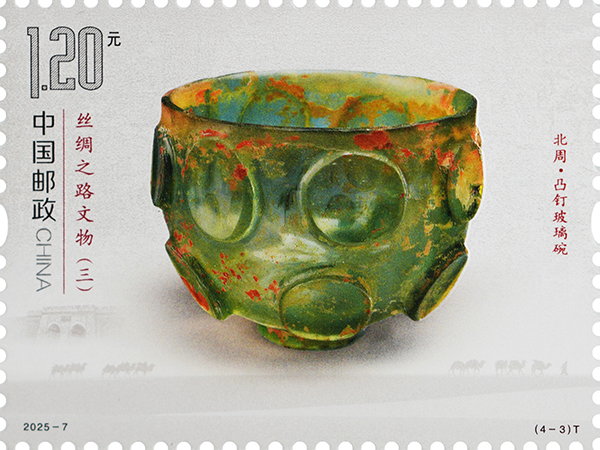 凸釘玻璃碗出土于寧夏固原市南郊的北周李賢夫婦合葬墓,現藏于寧夏回族自治區固原博物館。該碗為直口,矮圈足,通體透明,呈碧綠色,外壁飾以14個凸起的圓形裝飾兩周,上下錯位排列。其內壁光潔,外壁有薄層的金黃色分化物,其材質屬鈣鈉玻璃,含有較多其它礦物質,該形制在薩珊時期的伊朗高原十分流行。郵票將特種光油和三維浮雕起凸組合應用,玻璃碗晶瑩剔透的質感和立體感躍然紙上。固原作為絲綢之路西北咽喉門戶,見證了東西方文化交流交融,提供了考察當時東西方貿易極為重要的資料。