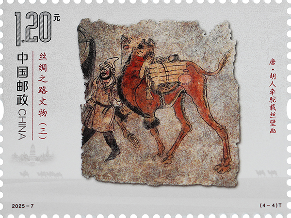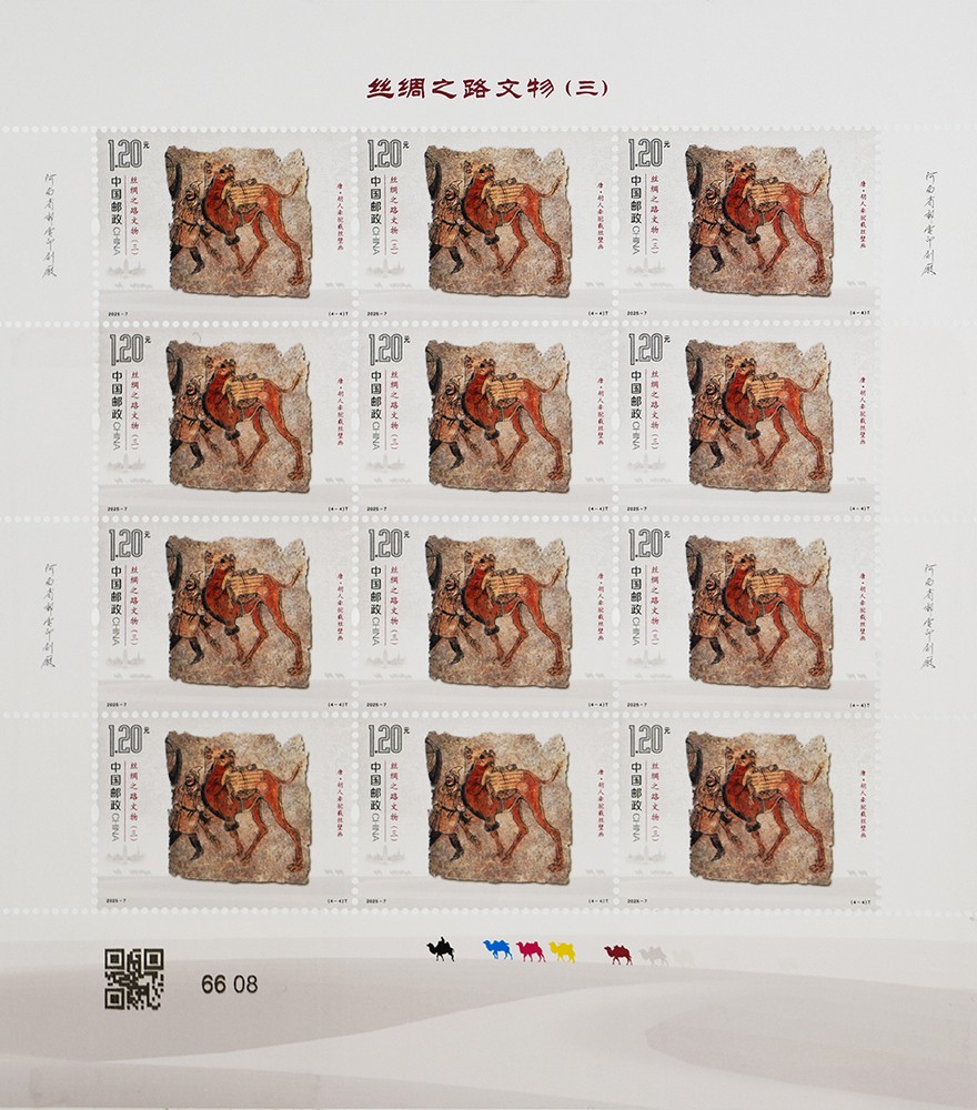 胡人牽駝載絲壁畫出土于河南省洛陽市安國相王孺人唐氏墓,現藏于洛陽古墓博物館。壁畫繪制在唐氏墓墓道西壁,正中一匹高大雄健的駱駝昂首挺胸、抬蹄甩尾、闊步前進。駱駝背上,是捆扎好的絲綢卷和瓶子。前面牽韁繩的西域人高鼻梁、絡腮胡,頭戴尖帽,身著翻領長衫,腳蹬黑色高靿靴,正邁步牽駝前行。該壁畫生動再現了各國商人來到絲綢之路的東方起點之一洛陽,裝載絲綢西行走上絲綢之路的場景,客觀地反映了唐代的社會場景和世俗風情,講述著文明交流互鑒的故事。郵票結合逆向上光和啞沙工藝,既展現出壁畫滄桑的歷史變遷,又突出壁畫中人物、飾物、動物等不同的色彩效果,賦予其獨特的藝術氣質。