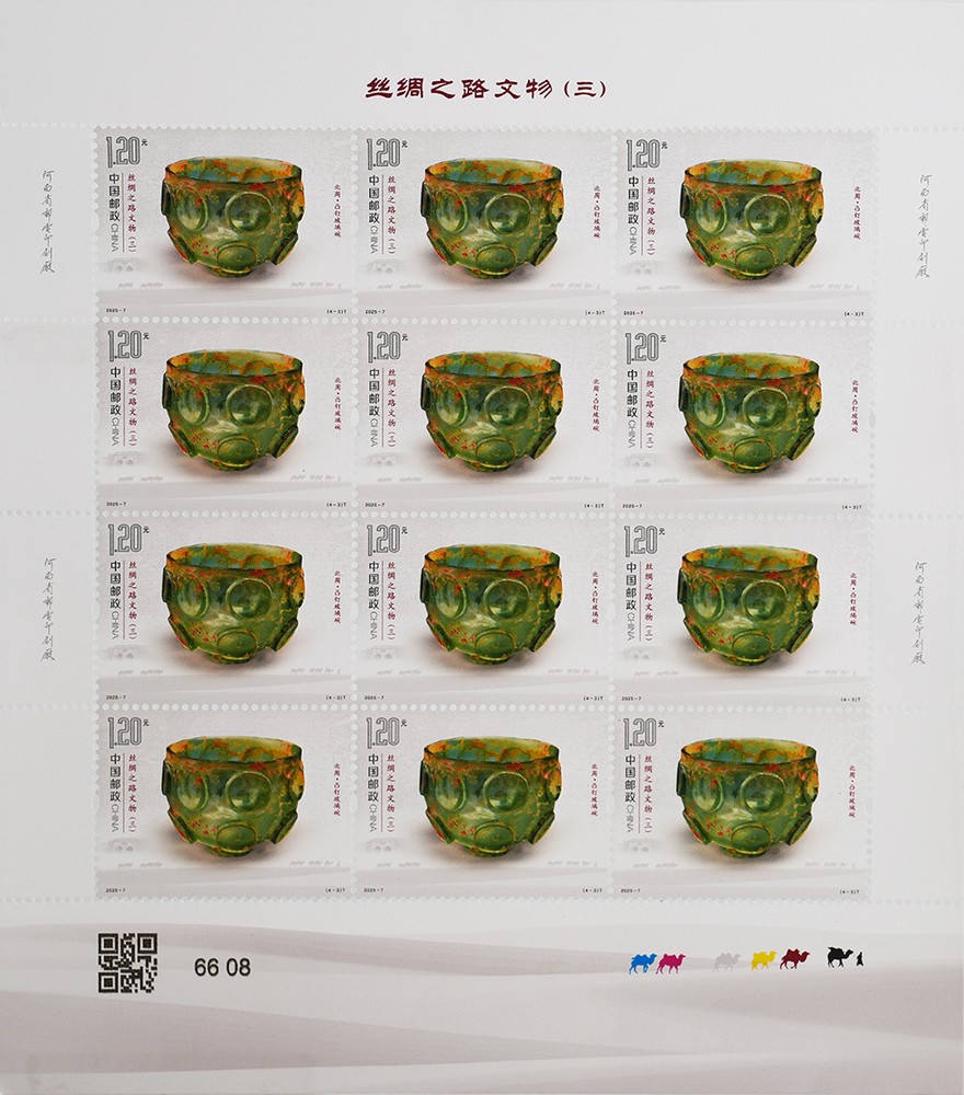中國郵政定于2025年5月18日發行《絲綢之路文物(三)》特種郵票1套4枚,郵票圖案名稱為:漢·“五星出東方利中國”錦護膊、南北朝·神人紋銀盤、北周·凸釘玻璃碗、唐·胡人牽駝載絲壁畫。全套郵票面值4.80元,計劃發行數量590萬套。