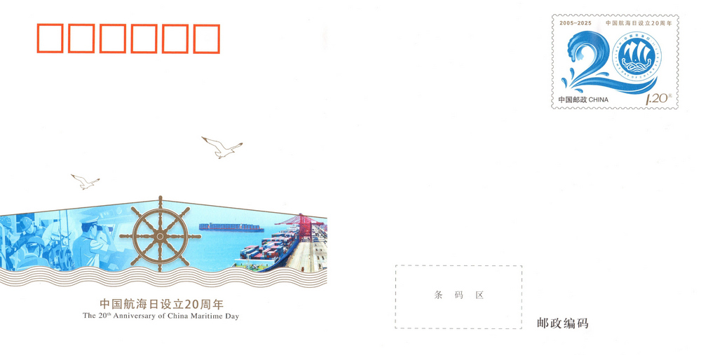 中國(guó)郵政定于2025年7月11日發(fā)行《中國(guó)航海日設(shè)立20周年》紀(jì)念郵資信封1套1枚。詳情如下: